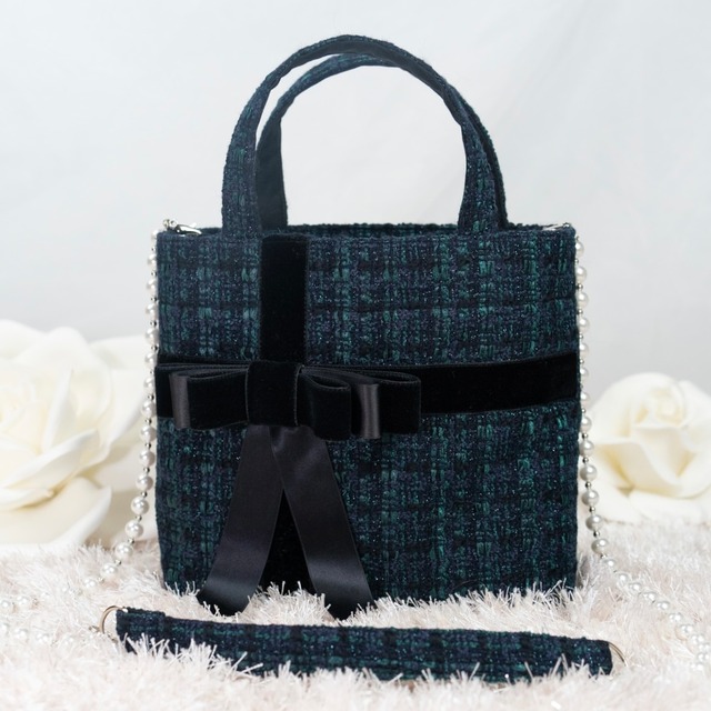 名前の通りホリデー感たっぷり⟡.· わくわくするようなプレゼントのラッピングをイメージしてお作りいたしました。 リボンはベロアとサテンの2種類を使いました♡ 可愛いのにluxuryで大人っぽい... とっても素敵なJewelry bagが完成しました♡ エメラルドのような深みのあるグリーンのツイードは、コーディネートに取り入れやすい絶妙なお色となっております⟡.·*. 今までのJewelry bagの中で一番大人っぽいバッグです♡ ツイードにシルバーのラメが入っているので、合わせて金具もシルバーにしております♡ 便利なマグネットボタンと内ポケットがついています。 内側の両サイドに金具がついているので、お手持ちのストラップを付けてショルダーバッグとしてもお使いいただけます♡ 5cmのマチがあるので小さいのにたくさん荷物が入るようになっています。 メインバッグとしてもサブバッグとしてもお使いいただけるとても便利なサイズ感です♡ こちらのJewelry bagは3つのみの販売です✧︎*。 周りとかぶる事がない特別なバッグ♡ 今後同じ生地×デザインの再販はございませんので、是非この機会にお迎えしてください♡ made in japan バッグ本体のみですので、チェーンは付属しません。 【Color】 グリーン 金具部分 : シルバー 【Size】 縦 20cm 横 20cm マチ 5cm ※サイズ表の実寸法は2cm程度の誤差がある場合がございますので、予めご了承くださいませ。 【素材】 表地 アクリル 43% ウール 26% ポリエステル 26% キュプラ 4% ナイロン 1% 裏地 コットン 100% ※光の入り具合や、お使いのパソコンやスマートフォンなどのモニター設定により、商品写真のお色が実物と異なる場合がございます。予めご了承の程お願い申し上げます。 ※ご注文後のお客様都合(イメージと違ったなど)でのキャンセルは承っておりません。予めご了承くださいませ。