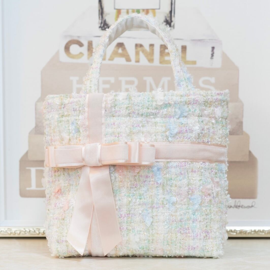 ホワイトベースのツイードに淡いピンク、水色、グリーンの様々な意匠糸が織り込まれています♡