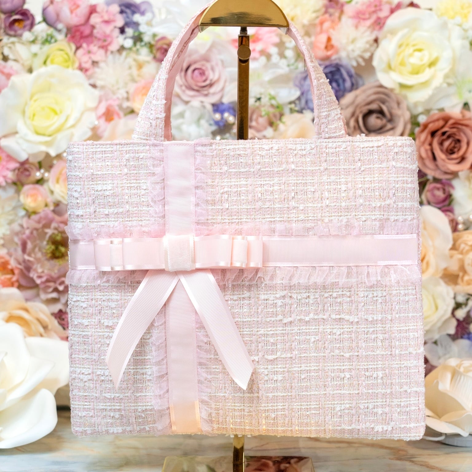ピンクと白の可愛いツイードにピンクのリボン、チュールフリルをお付けして甘々なバッグにお仕立てしました♡
