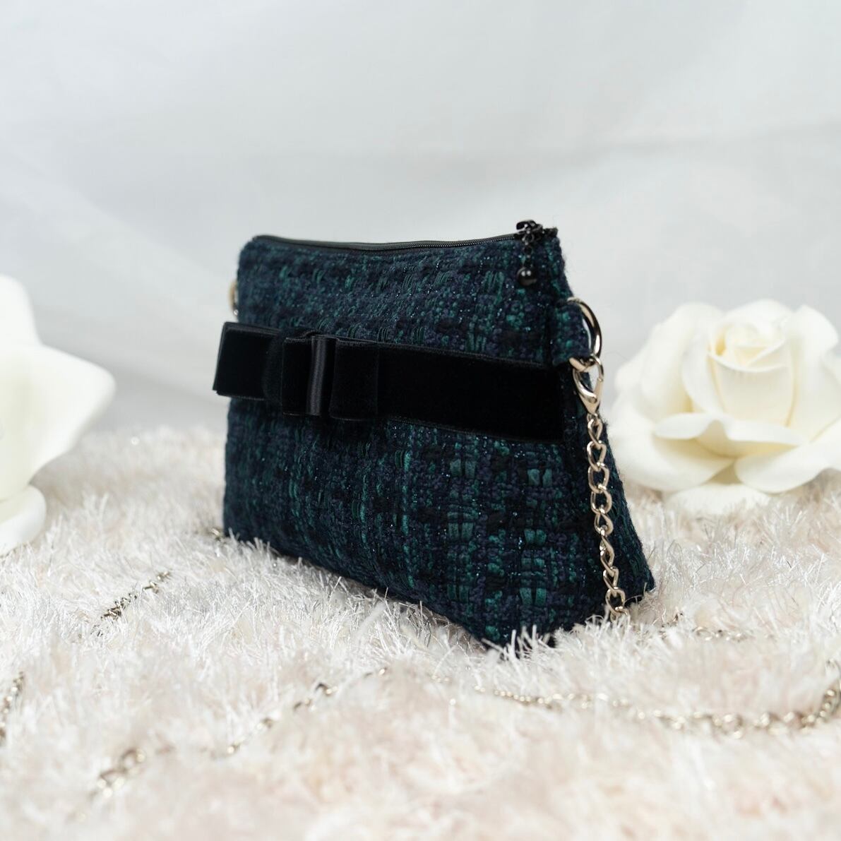 深緑のリボンと細かいラメも入っており、パッと見は落ち着いて見えますが、よく見るととても華やかなツイード生地となっております。