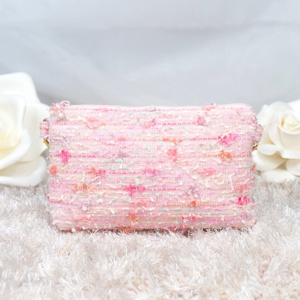 ピンクのツイードに、紫や翡翠のようなグリーン、濃いピンクや淡いピンクなど様々な糸が織り込まれていて、見ているだけでHappyな気持ちになるツイードです♡