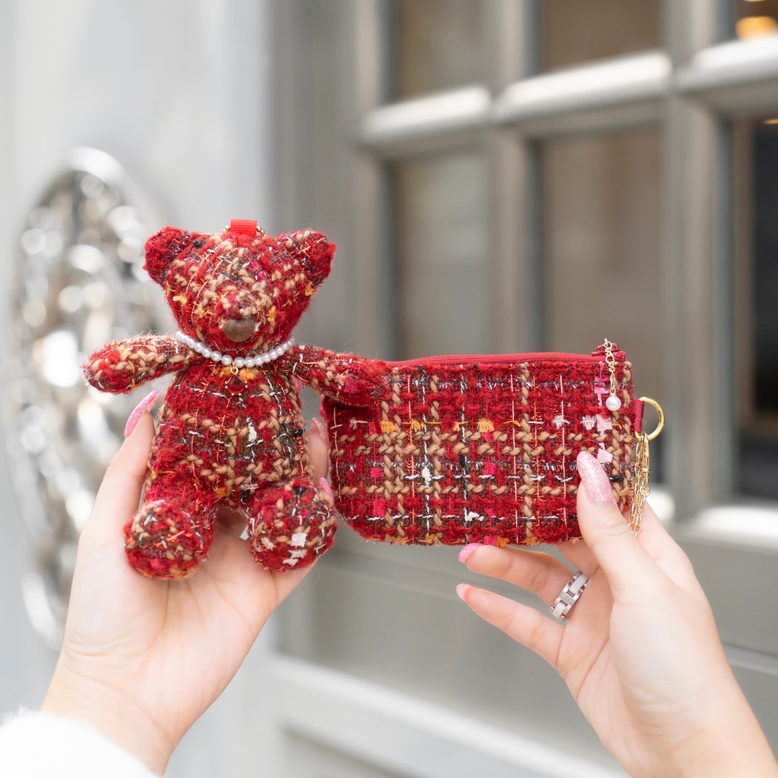 ネックレスはラメに合わせてゴールド、チャームはツイードと同じ赤色を選びました♡